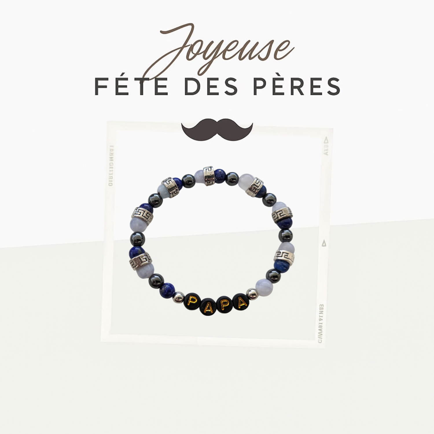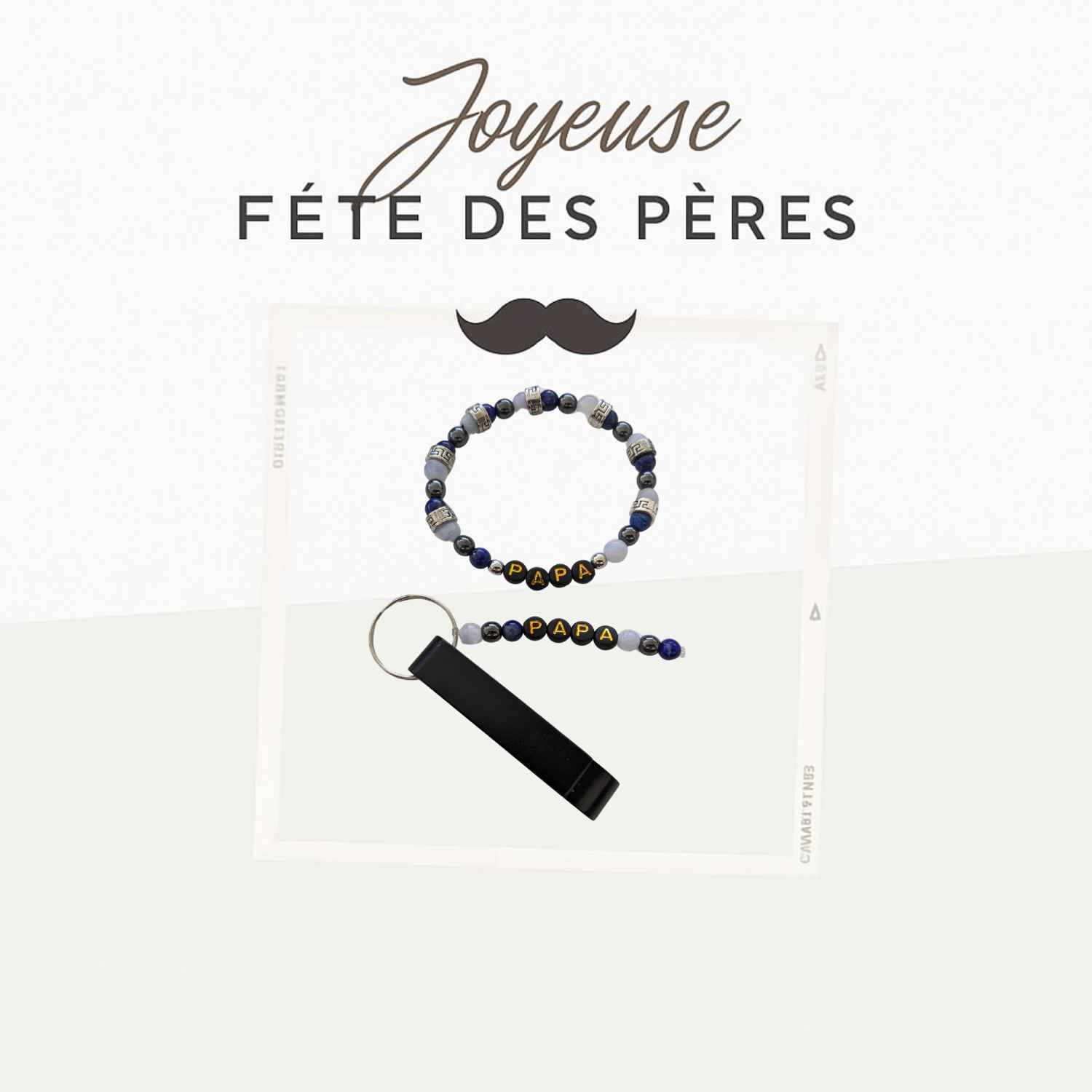 Très prochainement, c'est la Fête des Pères ! Pour cette occasion spéciale, nous vous proposons un lot exclusif composé d'un bracelet et d'un porte-clé personnalisé – il est possible d'y inscrire le prénom du papa pour un cadeau unique et chargé d'émotion.