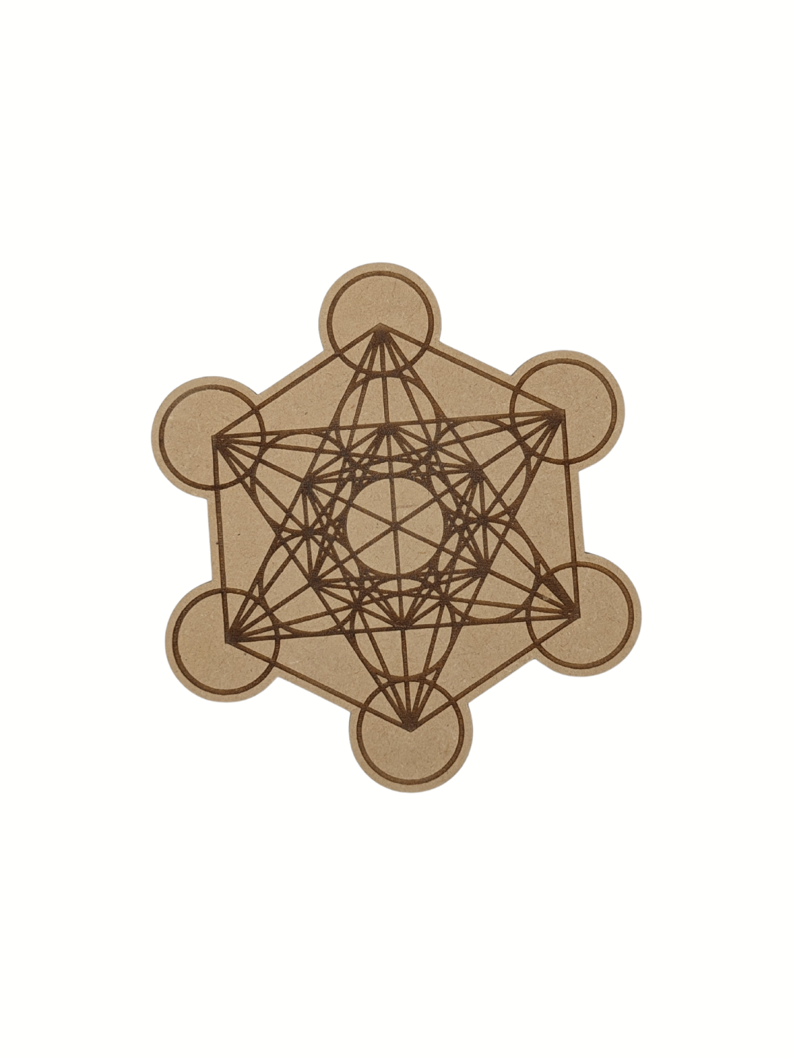 Elle peut être utilisée comme dessous de plat ou de verre en bois, alliant l'esthétique naturelle du bois à l'énergie harmonisant du symbole de Métatron.